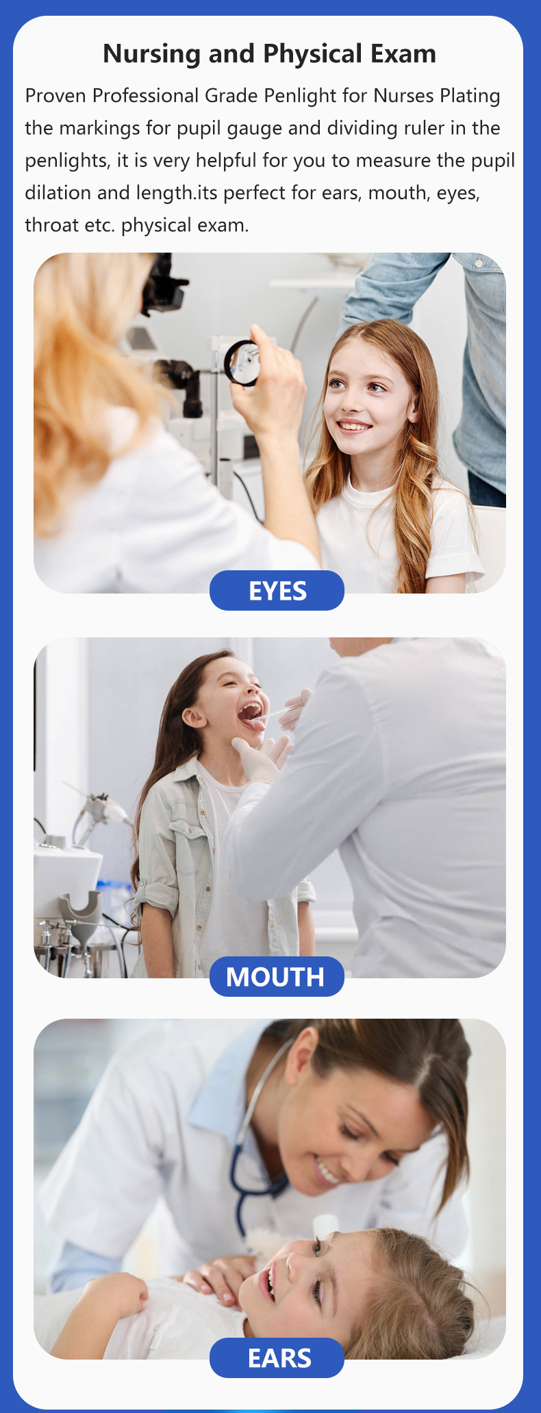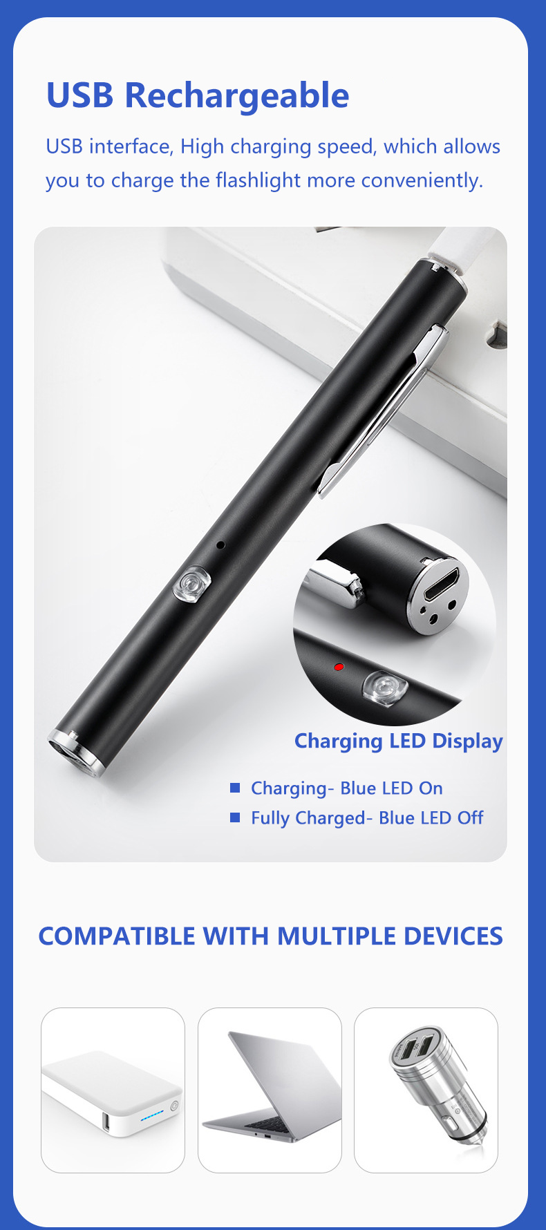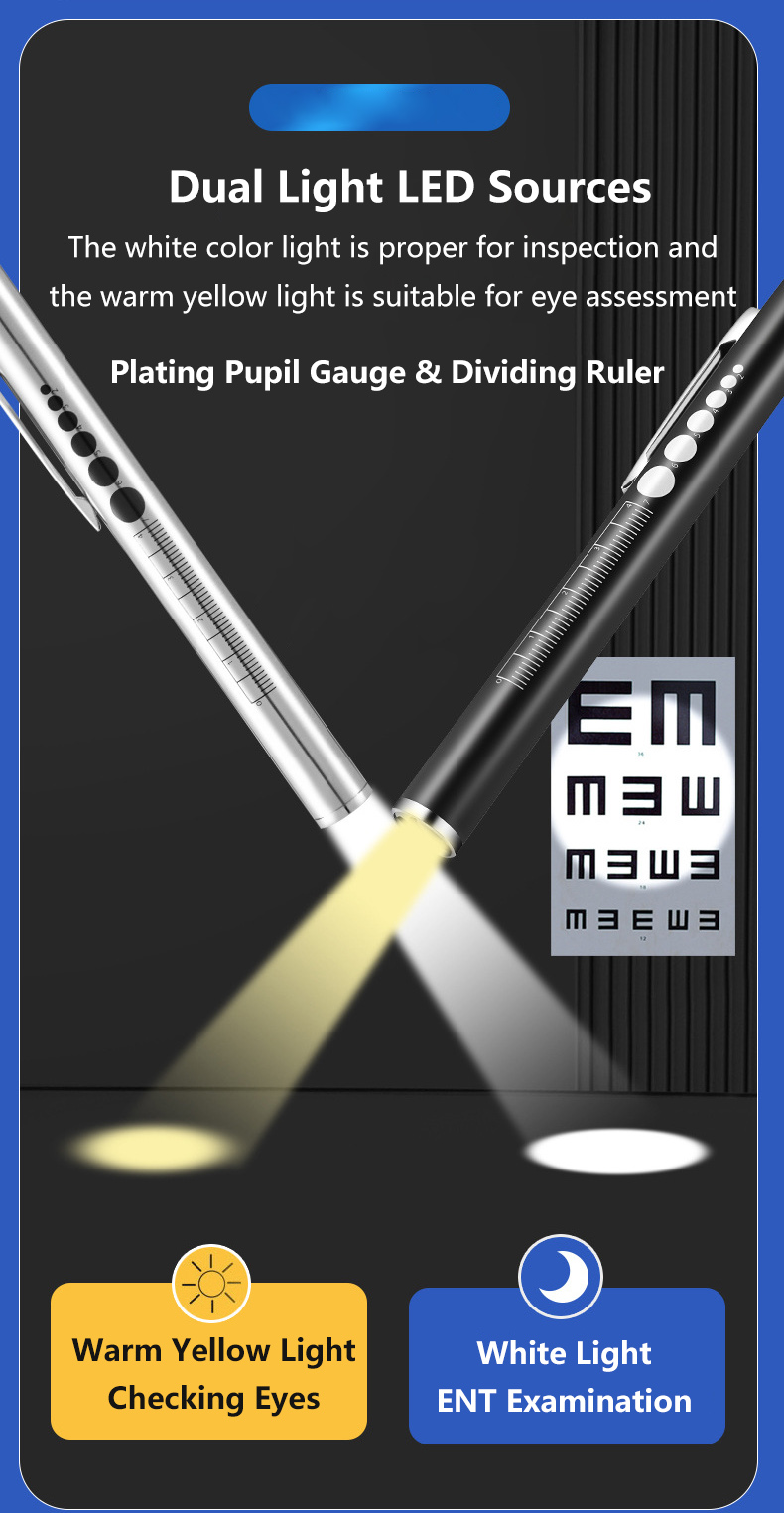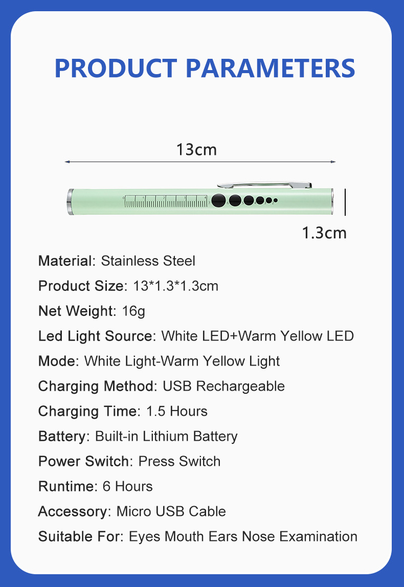 90;"]]],["p",{"ind":{},"spacing":{}},["span",{"data-type":"text"},["span",{"bold":true,"color":"rgb(15, 17, 17)","sz":10.5,"szUnit":"pt","data-type":"leaf"},"Material: Stainless steel;"]]],["p",{"ind":{},"spacing":{}},["span",{"data-type":"text"},["span",{"bold":true,"color":"rgb(15, 17, 17)","sz":10.5,"szUnit":"pt","data-type":"leaf"},"Light color: white light/yellow light, double light source."]]],["p",{"jc":"left","ind":{},"spacing":{}},["span",{"data-type":"text"},["span",{"color":"rgb(9, 9, 11)","sz":11,"szUnit":"pt","data-type":"leaf"},"Multipurpose Medical Penlight – Ideal for nurses, doctors, students, and medical professionals this penlight LED flashlight features dual beam lighting with white or yellow/warm colors to help you see with improved clarity.\nSlim, Compact, and Portable – Easy to slip into a front pocket, pair of scrubs, or clipboard our penlight for doctors and nurses even comes with a pen clip, so you can make an accessible tool that’s available whenever you need to see more clearly.\nOne-Touch Lighting Slide – Offering fast, efficient use our penlight flashlights feature a small slide on the side so you can quickly swap between lighting modes or turn it off in a pinch, so you can check patients and put it away with less distractions.\nLong-Lasting Rechargeable Battery – Our LED penlight is designed with a tail usb charging port and built-in USB rechargeable battery that’s quick and easy to recharge. The flashlight provides hours of reliable use so you can avoid having to waste money on batteries.\nProven Professional Grade Penlight for Nurses Plating the markings for pupil gauge and dividing ruler in the penlights, it is very helpful for you to measure the pupil dilation and length. Reusable Pen light has two soft tones, you can change the light tip to warmer yellow light or a bright led light. its perfect for eyes, ears, mouth, throat etc. physical exam."]]],["p",{"jc":"left","ind":{},"spacing":{}},["span",{"data-type":"text"},["span",{"data-type":"leaf"},""]]],["table",{"colsWidth":[325,325]},["tr",{},["tc",{"rowSpan":1,"colSpan":1},["p",{"jc":"left","ind":{},"spacing":{}},["span",{"data-type":"text"},["span",{"color":"rgb(9, 9, 11)","highlight":"rgb(243, 244, 248)","sz":11,"szUnit":"pt","data-type":"leaf"},"Material"]]]],["tc",{"rowSpan":1,"colSpan":1},["p",{"jc":"left","ind":{},"spacing":{}},["span",{"data-type":"text"},["span",{"color":"rgb(9, 9, 11)","sz":11,"szUnit":"pt","data-type":"leaf"},"Stainless Steel"]]]]],["tr",{},["tc",{"rowSpan":1,"colSpan":1},["p",{"jc":"left","ind":{},"spacing":{}},["span",{"data-type":"text"},["span",{"color":"rgb(9, 9, 11)","highlight":"rgb(243, 244, 248)","sz":11,"szUnit":"pt","data-type":"leaf"},"Product Size"]]]],["tc",{"rowSpan":1,"colSpan":1},["p",{"jc":"left","ind":{},"spacing":{}},["span",{"data-type":"text"},["span",{"color":"rgb(9, 9, 11)","sz":11,"szUnit":"pt","data-type":"leaf"},"13*1.3*1.3cm"]]]]],["tr",{},["tc",{"rowSpan":1,"colSpan":1},["p",{"jc":"left","ind":{},"spacing":{}},["span",{"data-type":"text"},["span",{"color":"rgb(9, 9, 11)","highlight":"rgb(243, 244, 248)","sz":11,"szUnit":"pt","data-type":"leaf"},"Net Weight"]]]],["tc",{"rowSpan":1,"colSpan":1},["p",{"jc":"left","ind":{},"spacing":{}},["span",{"data-type":"text"},["span",{"color":"rgb(9, 9, 11)","sz":11,"szUnit":"pt","data-type":"leaf"},"16g"]]]]],["tr",{},["tc",{"rowSpan":1,"colSpan":1},["p",{"jc":"left","ind":{},"spacing":{}},["span",{"data-type":"text"},["span",{"color":"rgb(9, 9, 11)","highlight":"rgb(243, 244, 248)","sz":11,"szUnit":"pt","data-type":"leaf"},"Led Light Source"]]]],["tc",{"rowSpan":1,"colSpan":1},["p",{"jc":"left","ind":{},"spacing":{}},["span",{"data-type":"text"},["span",{"color":"rgb(9, 9, 11)","sz":11,"szUnit":"pt","data-type":"leaf"},"White LED+Warm Yellow LED"]]]]],["tr",{},["tc",{"rowSpan":1,"colSpan":1},["p",{"jc":"left","ind":{},"spacing":{}},["span",{"data-type":"text"},["span",{"color":"rgb(9, 9, 11)","highlight":"rgb(243, 244, 248)","sz":11,"szUnit":"pt","data-type":"leaf"},"Battery"]]]],["tc",{"rowSpan":1,"colSpan":1},["p",{"jc":"left","ind":{},"spacing":{}},["span",{"data-type":"text"},["span",{"color":"rgb(9, 9, 11)","sz":11,"szUnit":"pt","data-type":"leaf"},"Built-in Lithium Battery"]]]]],["tr",{},["tc",{"rowSpan":1,"colSpan":1},["p",{"jc":"left","ind":{},"spacing":{}},["span",{"data-type":"text"},["span",{"color":"rgb(9, 9, 11)","highlight":"rgb(243, 244, 248)","sz":11,"szUnit":"pt","data-type":"leaf"},"Suitable For"]]]],["tc",{"rowSpan":1,"colSpan":1},["p",{"jc":"left","ind":{},"spacing":{}},["span",{"data-type":"text"},["span",{"color":"rgb(9, 9, 11)","sz":11,"szUnit":"pt","data-type":"leaf"},"Eyes Mouth Ears Nose ENT Examination"]]]]]],["p",{"jc":"left","ind":{},"spacing":{}},["span",{"data-type":"text"},["span",{"data-type":"leaf"},""]],["img",{"src":"https://static-01.shop.com.mm/p/831954389a919d699da43a455f6233c6.jpg","style":"width:790px;height:1682px;display:inline;vertical-align:middle","width":790,"height":1682},["span",{"data-type":"text"},["span",{"data-type":"leaf"},""]]],["span",{"data-type":"text"},["span",{"data-type":"leaf"},""]]],["p",{"jc":"left","ind":{},"spacing":{}},["span",{"data-type":"text"},["span",{"data-type":"leaf"},""]],["img",{"src":"https://static-01.shop.com.mm/p/100065c8672b0b6fb93235056211547f.jpg","style":"width:790px;height:1148px;display:inline;vertical-align:middle","width":790,"height":1148},["span",{"data-type":"text"},["span",{"data-type":"leaf"},""]]],["span",{"data-type":"text"},["span",{"data-type":"leaf"},""]]],["p",{"jc":"left","ind":{},"spacing":{}},["span",{"data-type":"text"},["span",{"data-type":"leaf"},""]],["img",{"src":"https://static-01.shop.com.mm/p/7bb912f3f61c91d15c88403e251866e2.jpg","style":"width:790px;height:1269px;display:inline;vertical-align:middle","width":790,"height":1269},["span",{"data-type":"text"},["span",{"data-type":"leaf"},""]]],["span",{"data-type":"text"},["span",{"data-type":"leaf"},""]]],["p",{"jc":"left","ind":{},"spacing"