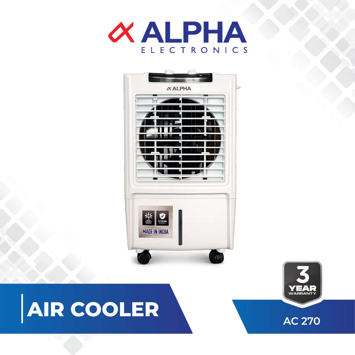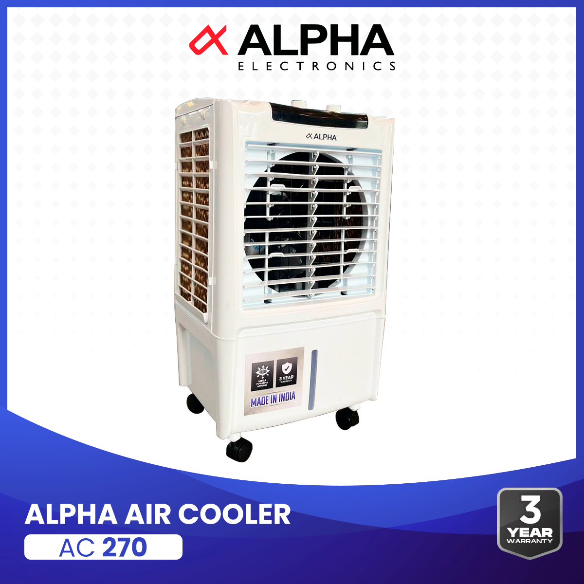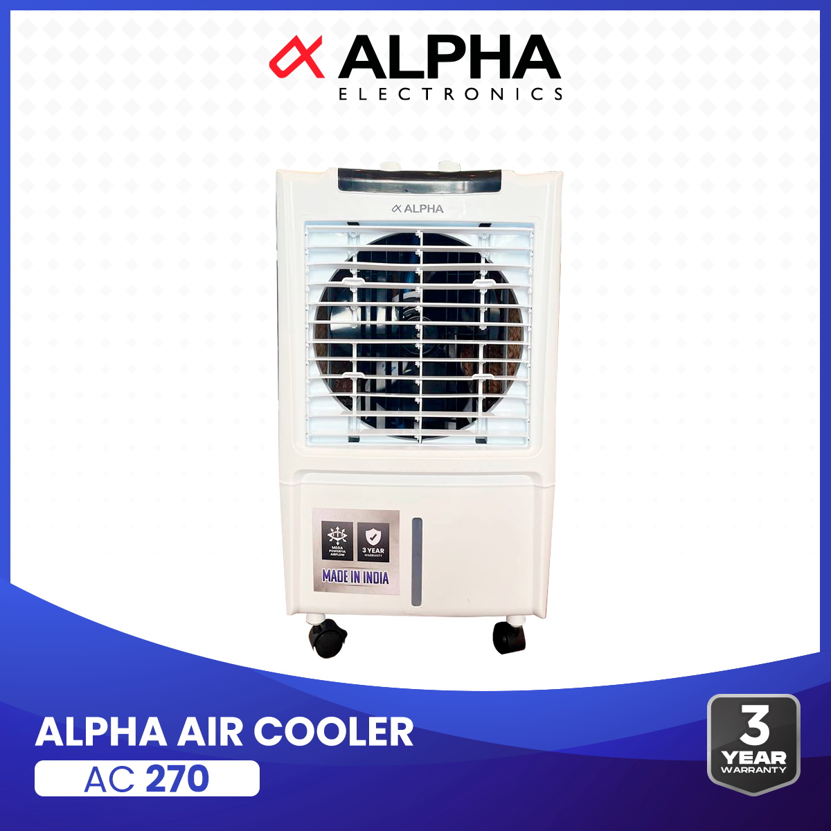 ALPHA AIR COOLER (AC-270) Voltage - 220/240 V , 50HzAC Power - 110W 27Liter Net. 6.4KG , Gross -8.6 KG 452x435x732 mm