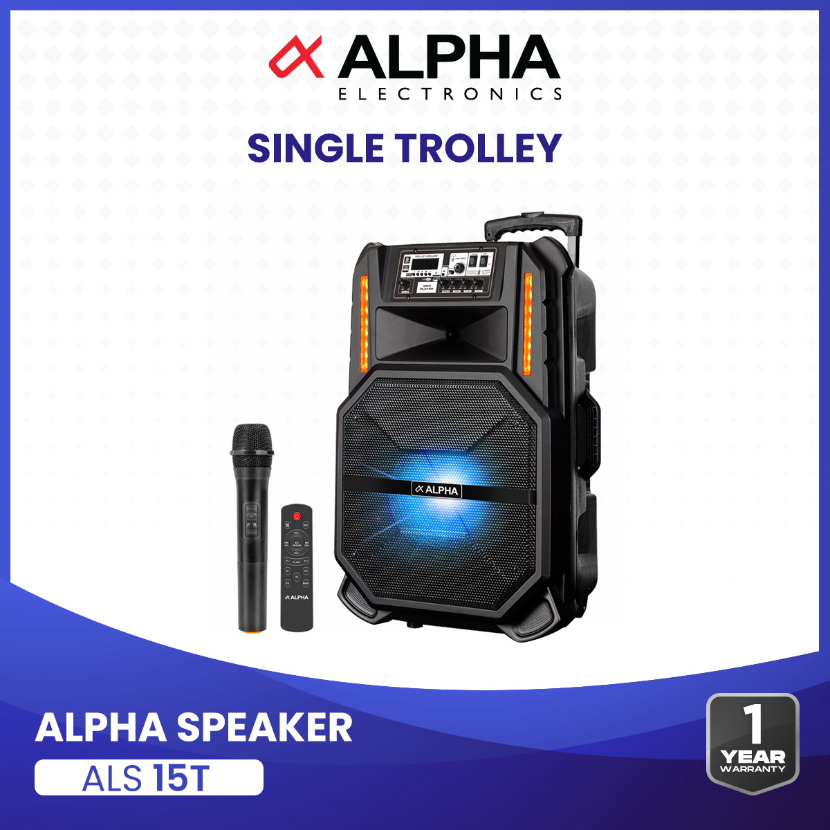 Single Trolley 15 inches remote included 1 Mic included USB/SD card/AUX Bluetooth/FM Build in rechargeable Battery 240W LED Colour Light 1 year warranty