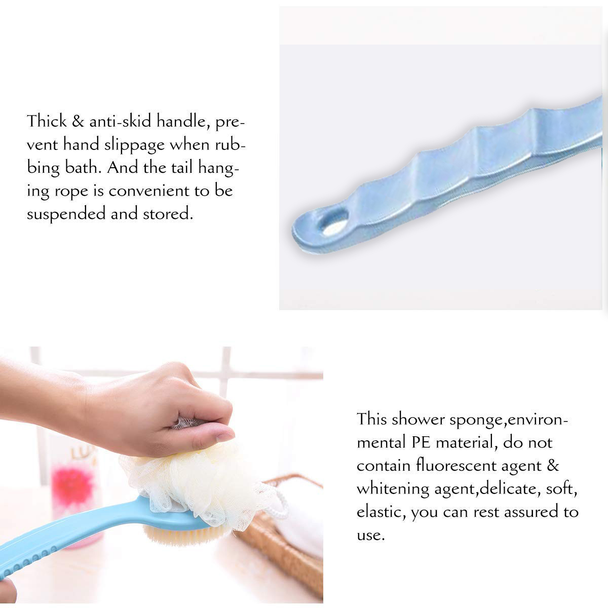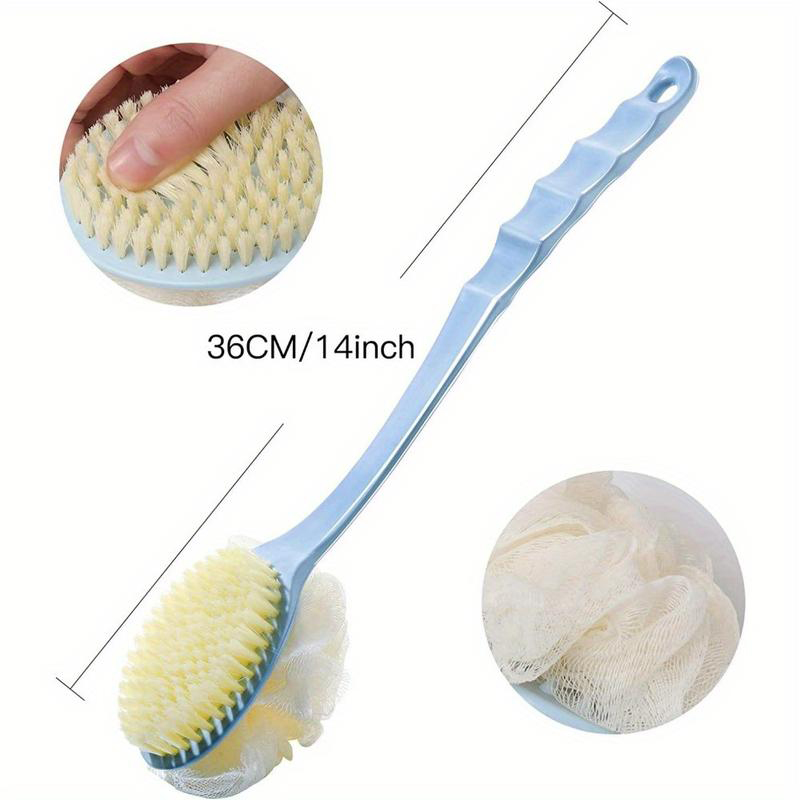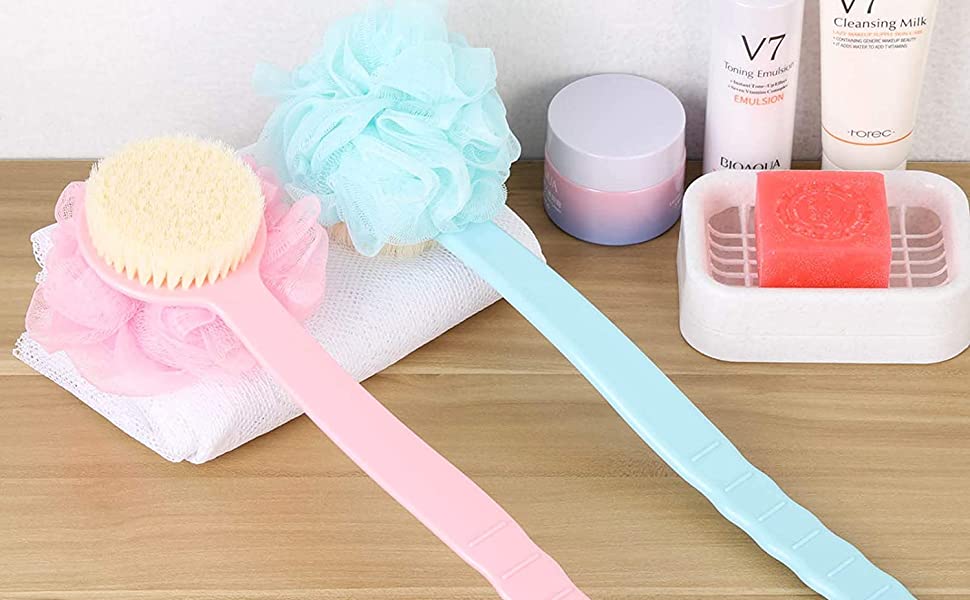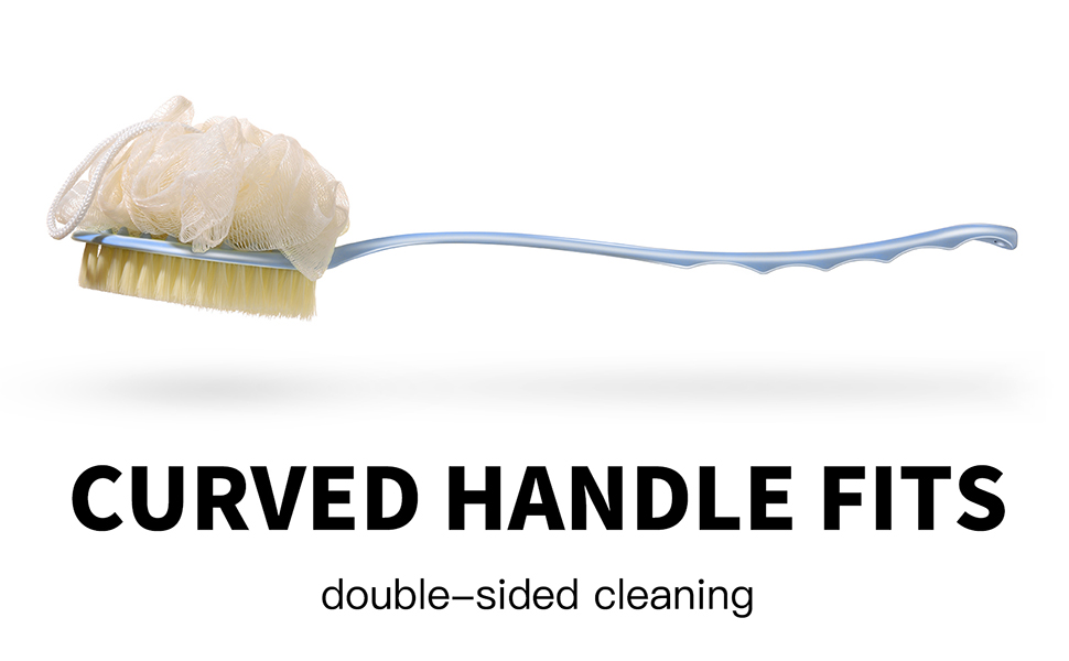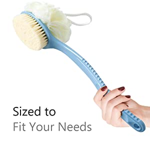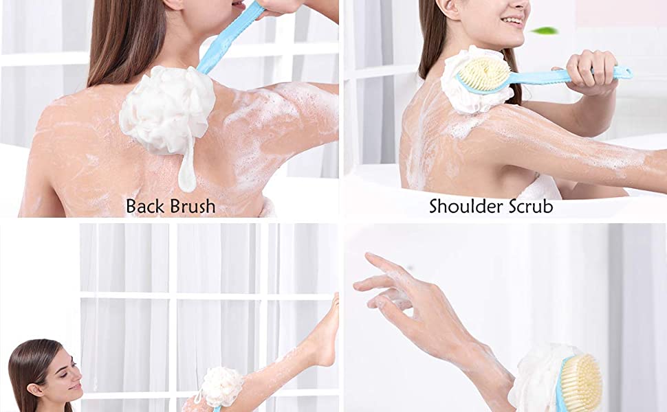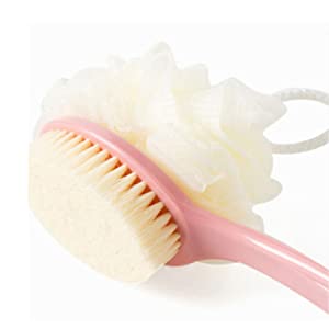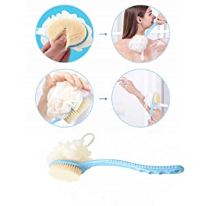 | DUAL SIDED BACK BRUSHBristle and Loofah 2 in 1 Shower Back Body Scrubber. Use Any One Side You Like. Very Conveniently to Preparing these two Separately Bathing Items.To Rejuvenate the Most Sensitive Skin, Improving Circulation and Skin Health. | Soft BristleDegradable soft nylon for sensitive skin. | BODY SAFEOur body scrub brush's head is made of 100% natural Comfort nylon bristles and soft bristles, healthy and comfortable. Long-handled is made of plastic 100% BPA-free, kind to sensitive skin |