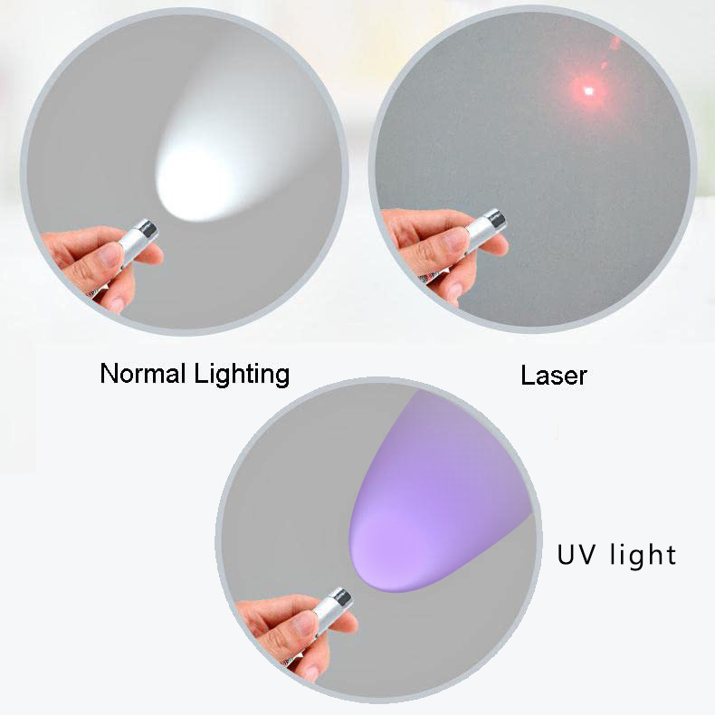 Laser color: Red Wavelength: 650nm Laser Output: 1mw Light Style: Beam Light Power Supply: 3 x LR44 Button Batteries (included and inserted in each pen) Switch: Button for laser and button for LED Flashlight and UV Light Output Wave: Continuous Wave Body Color: Silver Body Material: Metallic Copper Product Weight: Approx 15g (each) Dimension: 54mm x 9mm