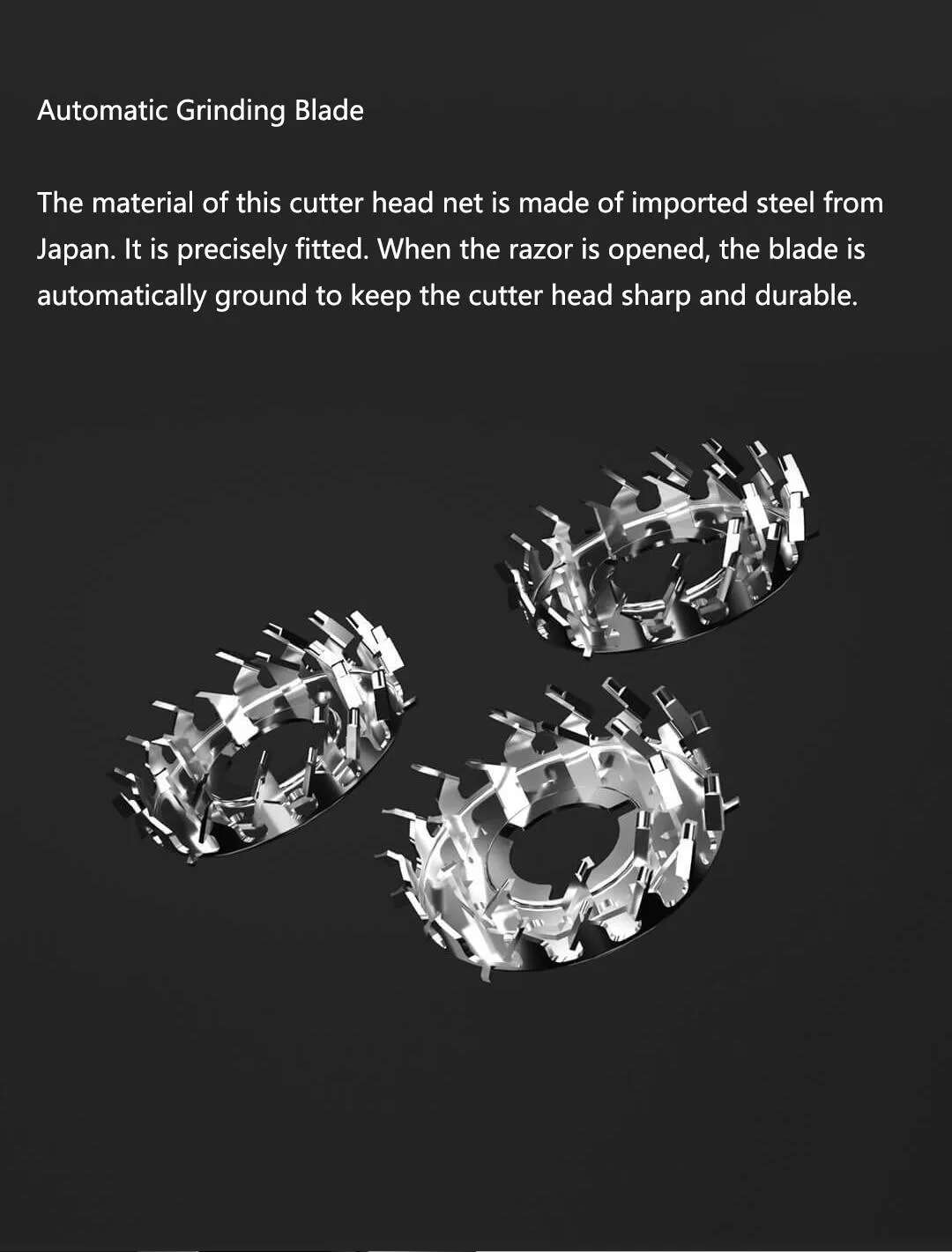 Automatic Grinding Blade The material of this cutter head net is made of imported steel from Japan. It is precisely fitted. When the razor is opened the blade is automatically ground to keep the cutter head sharp and durable.