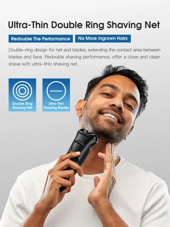 【Ultra-thin Double Ring Cutter】The knife net blades are double-loop design, which greatly increases the knife net and face contact area, and the shaving efficiency is doubled.