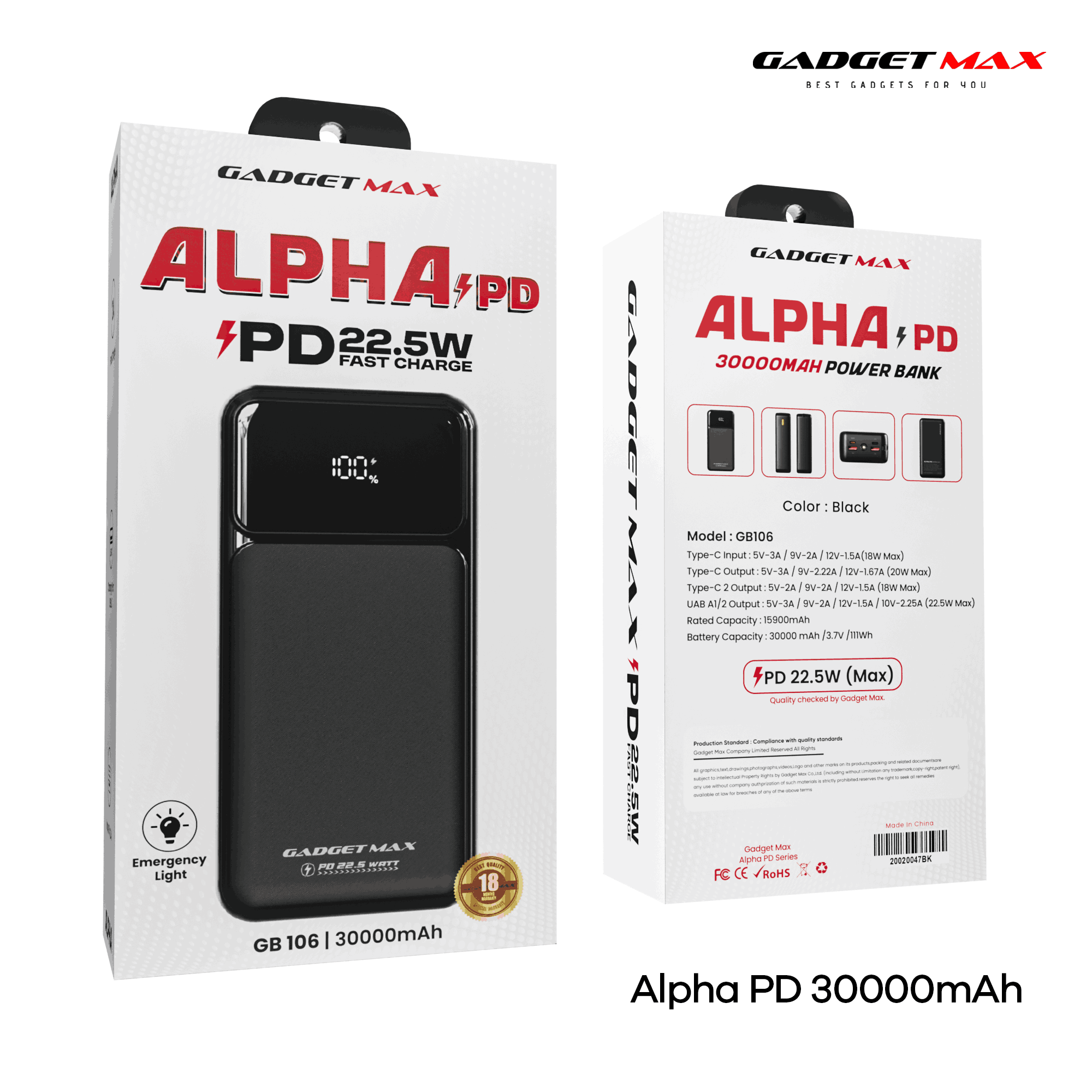GADGET MAX - GB106 Alpha PD 30000mAh PD+QC Fast Charging Digital Power Bank ( 20W + 22.5W )