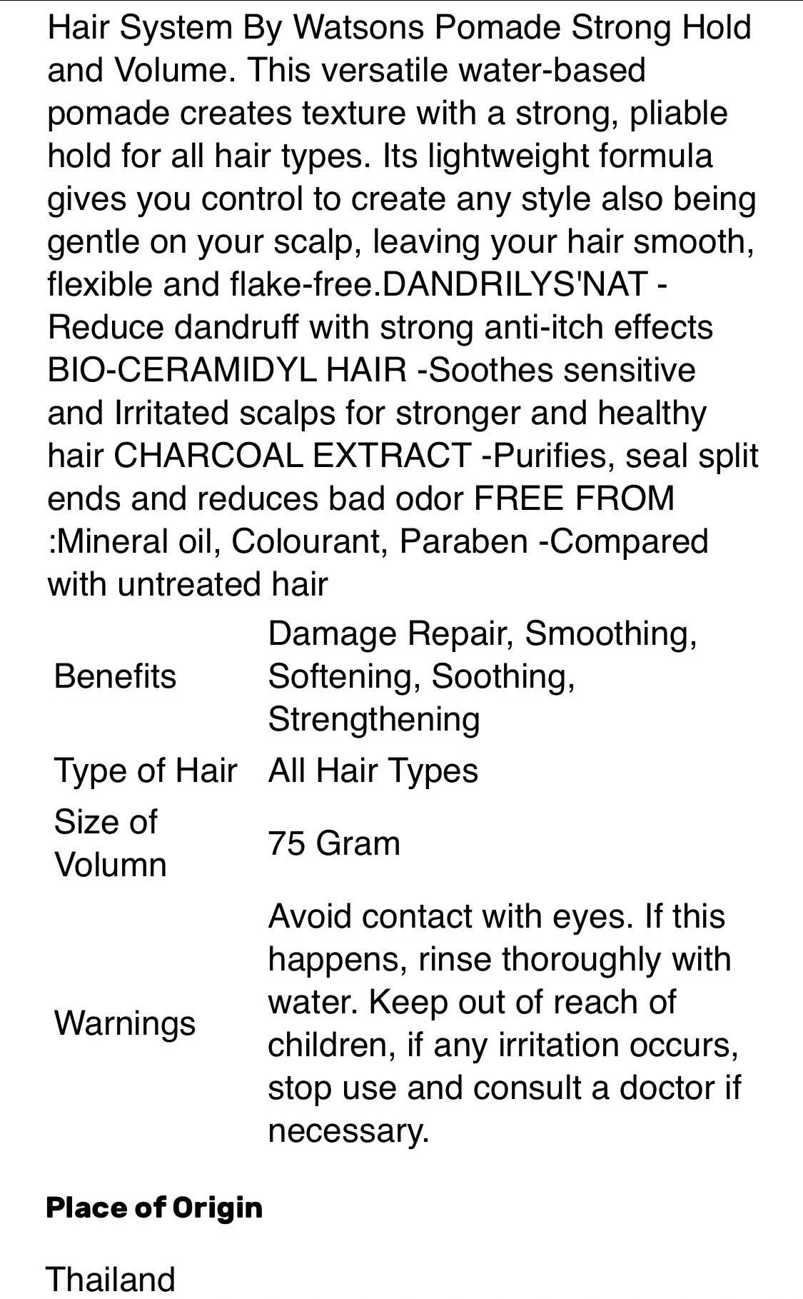 Hair System By Watsons *Pomade Professional Strong Hold and Volume *75grams *Made in Thailand 100% Authentic *water based *light weight *Unisex