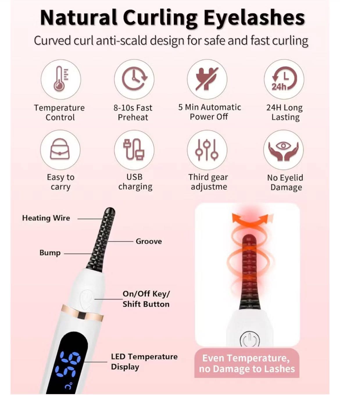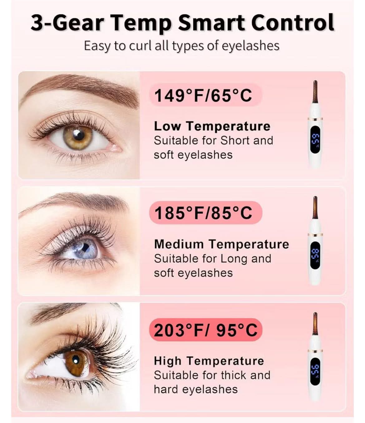 Get beautifully curled lashes effortlessly with our Heated Eyelash Curler! ✅ Fast Heating in Just 10 Seconds – Be ready in a flash. ✅ 3 Adjustable Temperature Modes – Perfect for different lash types. ✅ LED Display – Real-time temperature and battery level. ✅ 24-Hour Long-lasting Curl – Keeps your lashes lifted all day. ✅ Rechargeable USB Design – Eco-friendly and convenient. ✅ Safe Anti-Burn Design – Gentle heat and protective comb prevents damage to lashes and skin. ✅ Portable & Lightweight – Perfect for travel or on-the-go touch-ups.