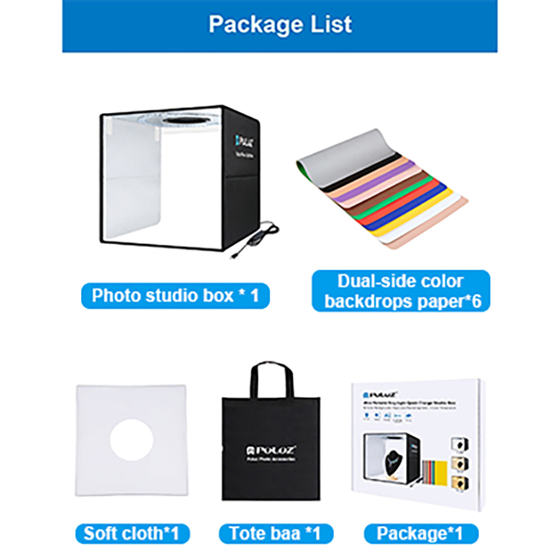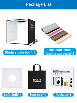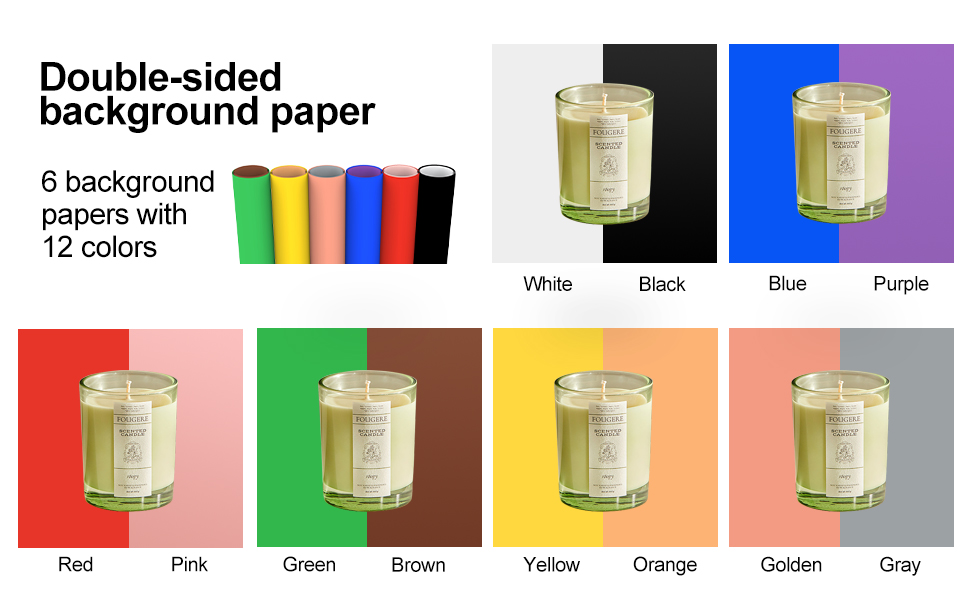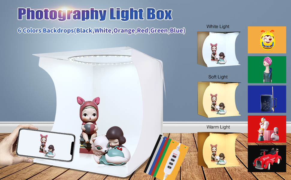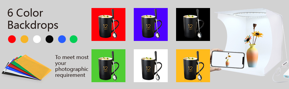 The light box comes with 6 colors detachable backgrounds (Black / white / Gray / gold / Yellow / orange / Red / pink / Blue / purple / Green / brown).