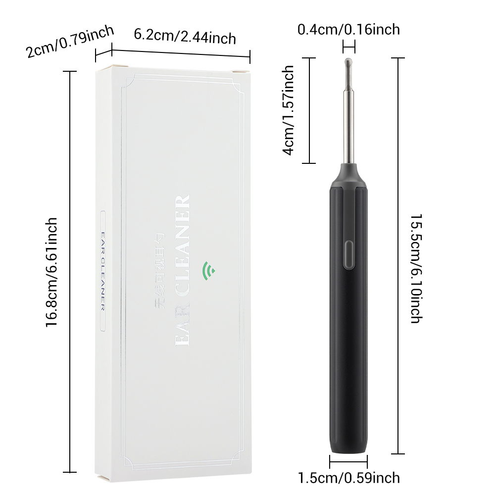 Material: ABS Colour: Black Lens inner diameter: 4.2mm Working frequency: 2.4Ghz Image transmission: 30fps Image sensor: CMOS Input parameters: DC5V0.4A Working voltage: 3.7V-4.2V Working power: 0.75W Best focal length: 0.4-2cm Gyroscope: Gimbal Gyroscope Lens Battery type: polymer lithium battery Capacity: 200mAh Charging time: 1.5 hours Use time: 90 days WiFi name: earpick_xxxx Ear spoon net weight: 17g Main body size: 15.5 (including ear spoon 4cm) *1cm diameter