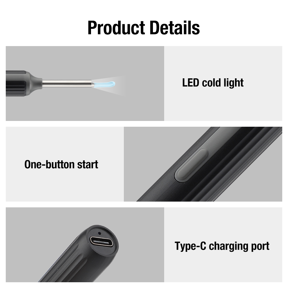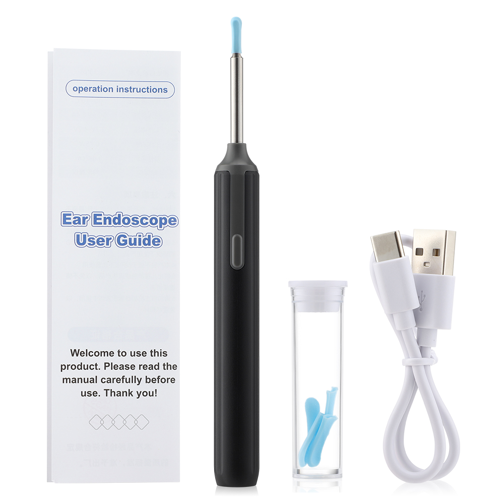 1*Black ear spoon host 4*Replaceable ear pick sets (with storage box) 1*Type-C charging cable 1*Manual in Chinese and English
