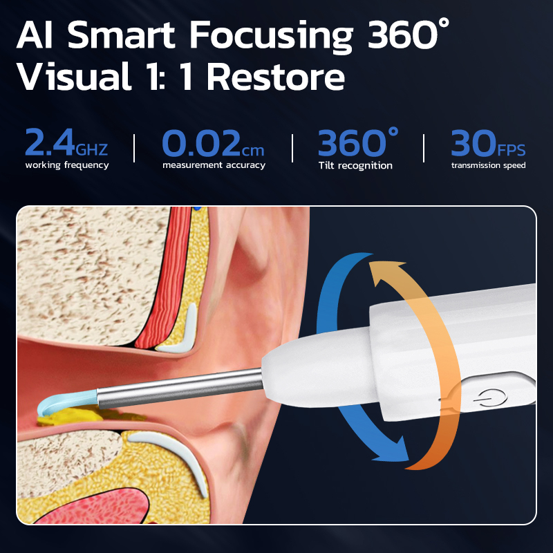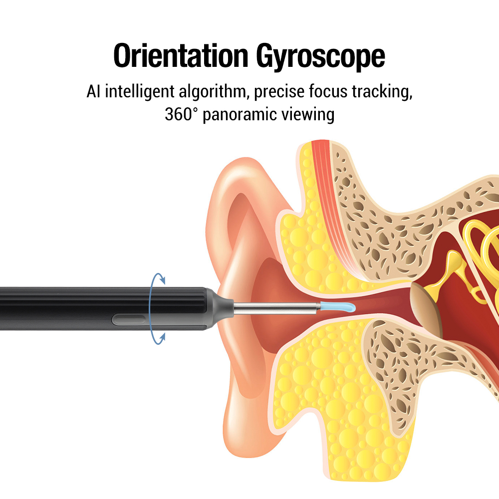 The directional gyroscope 360° has no dead angle for ear picking, and the AI intelligent algorithm accurately aligns and tracks to ensure that the picture does not shift, which is convenient for daily inspection and cleaning of the ear canal.