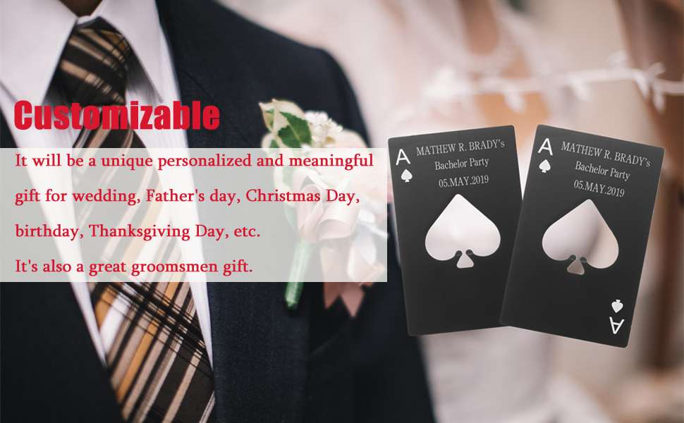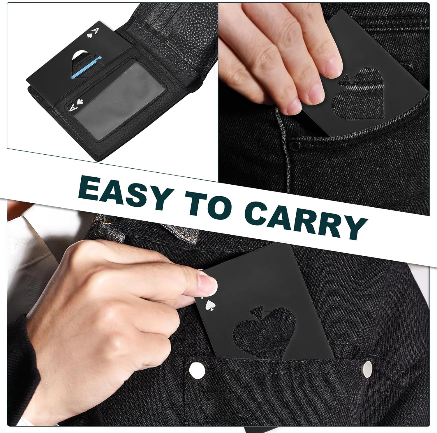 Cool Bottle Opener Card, Creative Bottle Opener Funny Stainless Steel for Playing Cards, Size Fits in Your Wallet Credit Card Size, Hard to Break or Bend √ Premium material: This bottle opener is made of excellent stainless steel material with high strength and flexibility, which provides corrosion resistance, oxidation resistance, rust resistance and long service life. √ Easy to use: use the cleverly designed hole in the middle in the shape of a spade to open your beer and soda bottles. Simple home, highlight individuality. Unique shape, hollow design, unique bottle opening method, exquisite workmanship, convenient to use. √ Easy to carry. The slim style fits easily in your pocket, easy to carry. The card bottle openers are small but powerful and durable enough to handle any bottle stopper. Easy to store in a wallet or other small space. √ Wide Applications: This bottle opener keychain for men is suitable for all kinds of beer, water bottles etc.Used for parties, weddings, Christmas, birthdays, Thanksgiving, groomsman and bridesmaid gifts, fairs, anniversary celebrations and more. √ Unique design: our poker bottle opener adds a special touch to your life. Slim and unique. √ HIGH QUALITY MATERIAL: Made of durable stainless steel for durability. Corrosion-resistant, rust-proof and easy to clean. √ Lightweight and portable: compact size of 8.5 x 5.4 cm, fits comfortably in your pocket or purse. Ideal for travelling. √ VERSATILE OCCASIONS Perfect for parties, weddings, holidays and more. Ideal gifts for different occasions.
