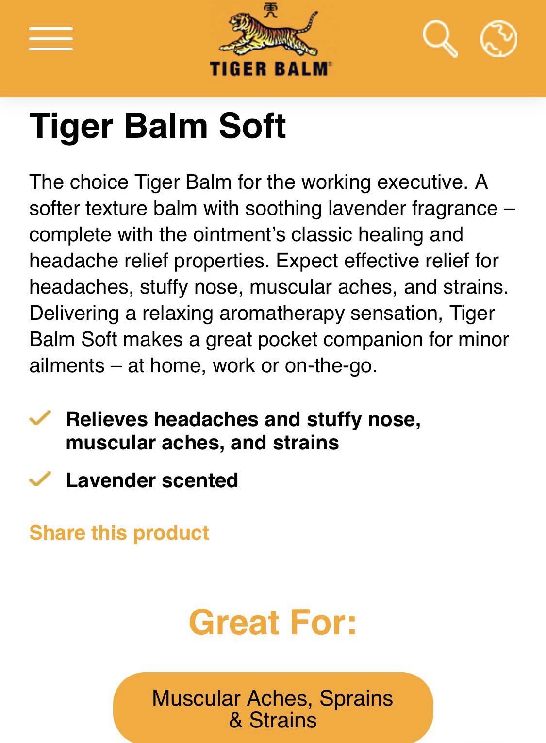 TIGER BALM SOFT *100% Authentic Effective relief for dizziness, stuffy nose, itchiness, muscular aches and pains, sprains, flatulence and insect bites *25grams *Expired 2029