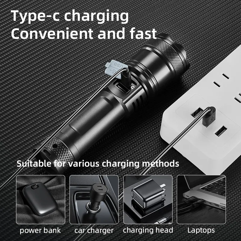 📌 အကျဉ်းချုပ် Upgraden TY-908 LED flashlight သည် ABS plastic ဖြင့်ပြုလုပ်ထားပြီး wear-resistant & non-slip ဖြစ်သည်။ High brightness P50 bulb နှင့် 1200 lumens အလင်းအားပေးနိုင်ပြီး 1500m အထိ照射နိုင်သည်။ 3 brightness modes (Strong/Weak/Flash) + Tail light + Zoom function ပါဝင်သည်။ 26650 lithium battery တစ်လုံးဖြင့် 3–12 နာရီအထိအသုံးပြုနိုင်ပြီး Type-C ဖြင့် 4 နာရီအတွင်း အပြည့်အဝ charge လုပ်နိုင်သည်။ Package တွင် Flashlight + USB Charger ပါဝင်သည်။
