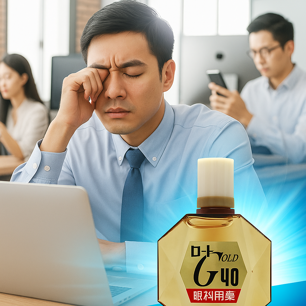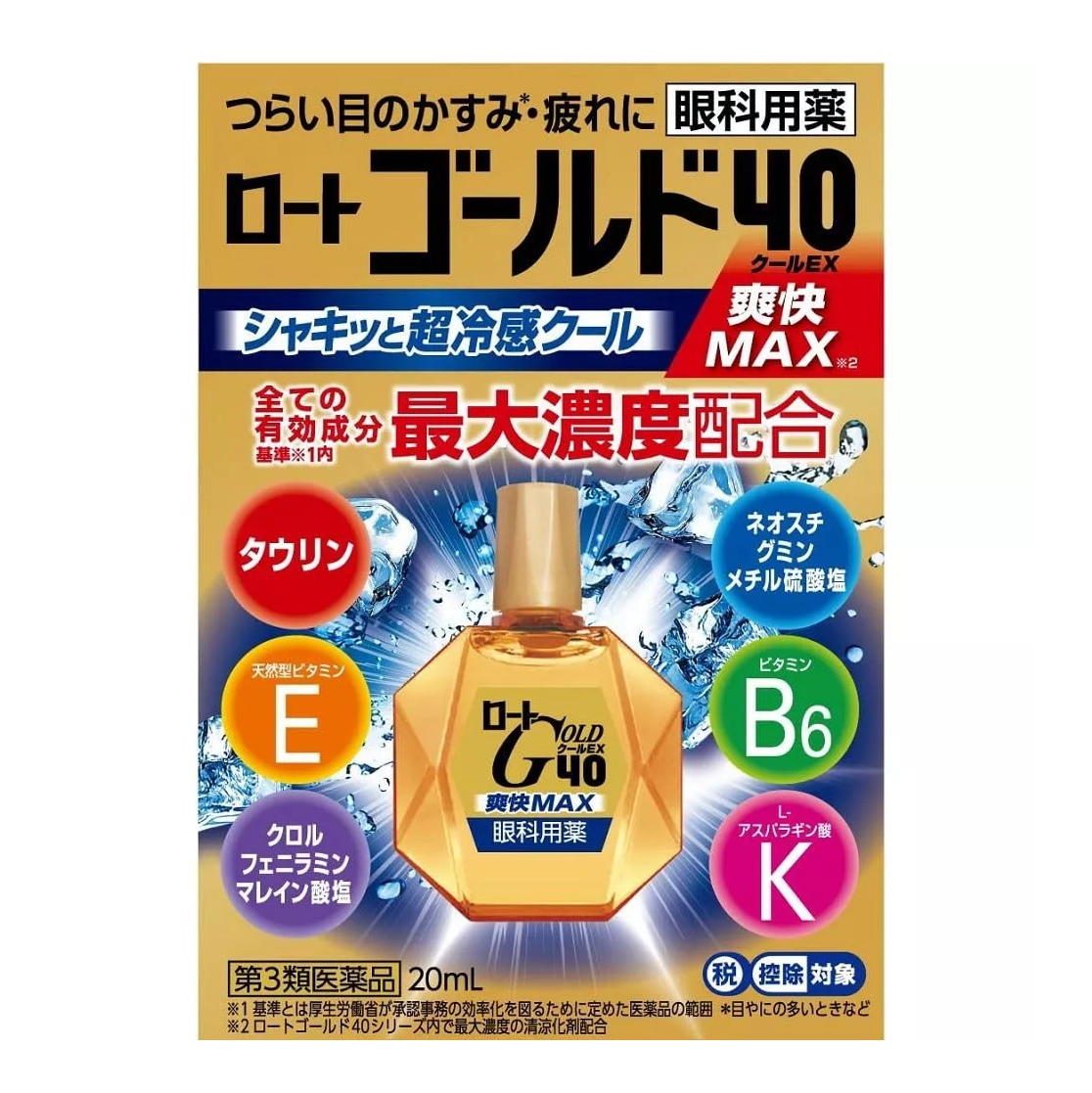 "V Rohto Gold 40 Refreshing MAX" is an eye drop that focuses on eye problems of middle-aged and elderly people. Contains all 6 active ingredients, including taurine, at the maximum concentration within the standard4. Effectively improves painful eye fatigue and blurred vision1 caused by age, etc. Recommended for middle-aged and elderly people and those who tend to get tired eyes from using a computer, etc.