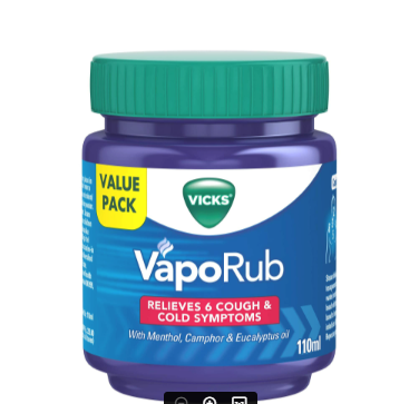 VICKS VapoRub ဟာ ချောင်းဆိုးခြင်း၊ အအေးမိခြင်းနဲ့ ဆက်စပ်ရောဂါလက္ခဏာတွေကို သက်သာစေဖို့ အသုံးပြုတဲ့ ဆေးတစ်မျိုးပါ။ ၎င်းမှာ menthol၊ camphor နဲ့ eucalyptus ဆီတို့ ပါဝင်ပြီး အသုံးပြုတဲ့နေရာမှာ နွေးထွေးတဲ့ ခံစားချက်ကို ပေးစွမ်းနိုင်ပါတယ်။